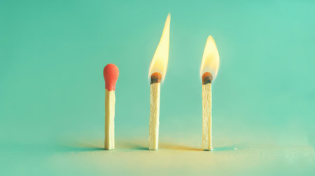 Group of different matches, some burning, pastel blue background, leadership, idea generation, teamwork. Generative AI.