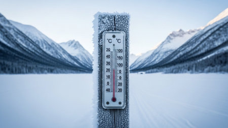 Ice cold thermometer in ice and snow