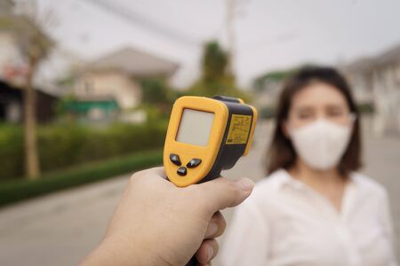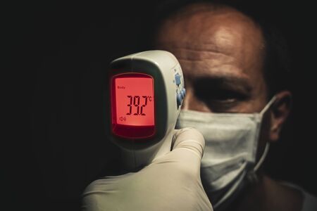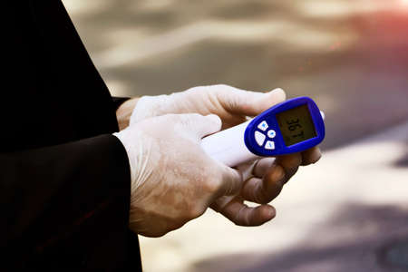 Man in medical gloves holding non contact thermometer.Digital isometric gun.Health care and covid prevention concept.
