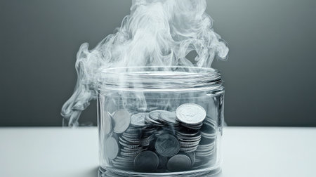 A captivating image featuring a jar filled with coins, enveloped in rising smoke. The contrast between the solid coins and ephemeral smoke creates a striking visual narrative.