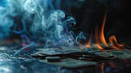 Dollar bills burning on ashes symbolize financial crisis, inflation, recession, and economic collapse, representing loss of investment and value