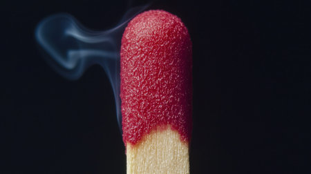 Bright red matchstick head ignites, producing smoke that gently spirals upward against a dark backdrop, illustrating the process of combustion and fire.