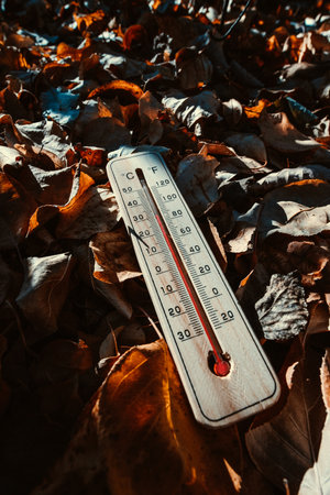 Thermometer on autumn leaves. Conceptual image of weather forecast.
