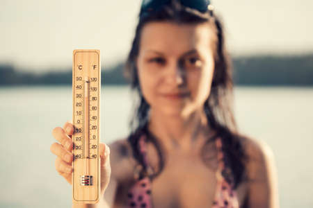 Beautiful young woman with a thermometer in her hand on the background of the lake. Summer vacation and heat concept, selective focus