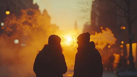 Generative AI Image of Back View of Silhouette Couple Standing in Street with Smog at Sunset