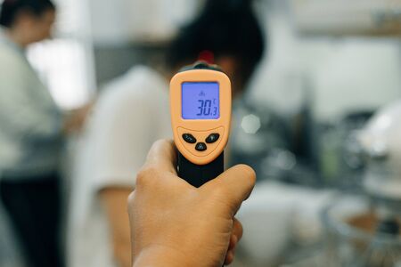 Digital thermometer checking temperature. Woman