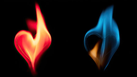 Two flames, one red and one blue, are presented against a stark black background. The flames display a dynamic form with a smooth texture and gradients. This image utilizes vibrant colors to create a visual impact, possibly suitable for designs that require a representation of energy, warmth, or contrast.