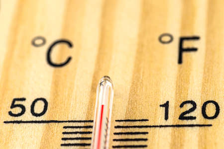 A macro shot of a classic wooden thermometer showing a temperature over 50 degrees Celsius, 122 degrees Fahrenheit.