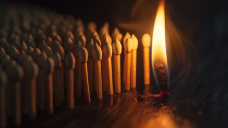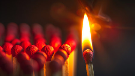 A bunch of matchsticks are lit up by a single flame. Concept of danger and destruction, as the matchsticks are on fire and could potentially cause harm