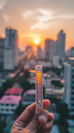 A thermometer reading high temperatures with the city skyline during sunset in the background. Urban heat effect depicted.