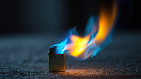 Blue and yellow flame flickering from a torch lighter in the dark, with a modern industrial look