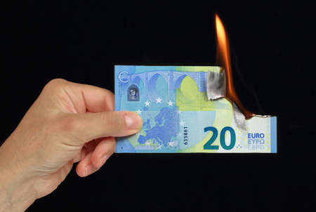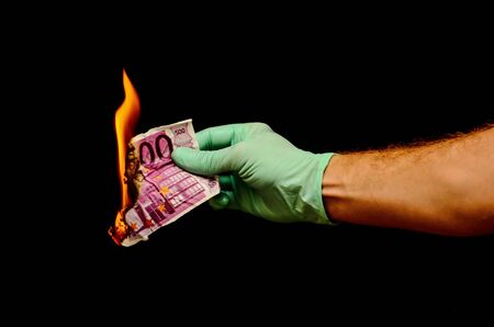 Burning euro banknote in hand on black background. Concept of crisis and inflation