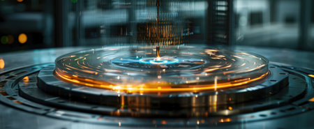 A futuristic quantum computing chamber glowing with holographic lights, symbolizing cutting-edge technology and advancements.
