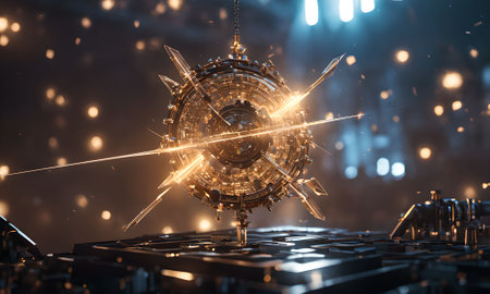 A glowing orange orb sits at the center of rotating metallic rings in a dark, high-tech environment. Bright lights and intricate patterns create a modern, dynamic atmosphere.