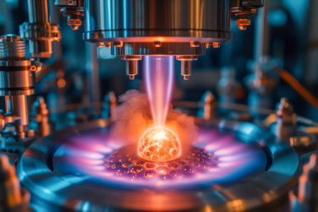 A captivating close-up view of advanced industrial equipment showcasing illuminated glass components. This high-tech machinery epitomizes innovation and precision in a contemporary workshop setting.