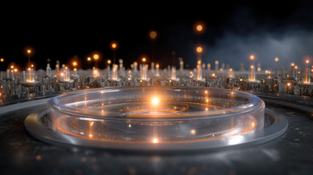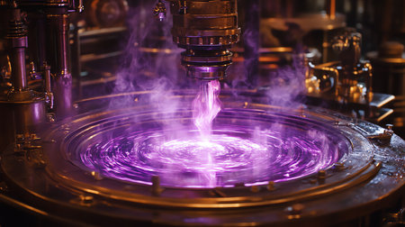 A close-up of an optical engine, with the focus on its glowing purple light emitting from within. The mechanical components around it display intricate designs and textures that give off futuristic vibes. In front is a circular glass disc covered in black plastic, which has a visible holographic pattern. A small droplet tube stands upright above them. This scene creates a sci-fi atmosphere, with neon lighting adding to the overall ambiance. --ar 53:30 --v 6.1 Job ID: 5972e2e0-8c26-40a3-89c4-4b3a29632eea