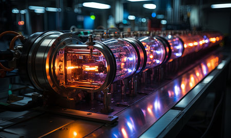 Glowing vacuum tubes emit warm orange light amidst creating an aesthetic blend of latest futuristic technology with contemporary elements environment.