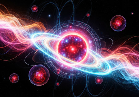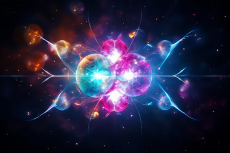 Complex visual of atomic structures intertwined with cosmic elements in vibrant colors and patterns.