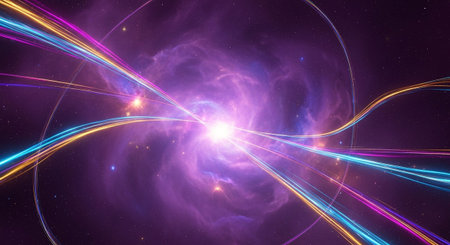 This vibrant digital artwork showcases an abstract cosmic scene with swirling lines and colorful particles, representing the beauty of the universe.