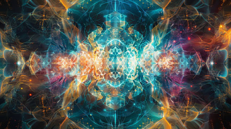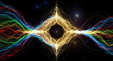 A symmetrical and mesmerizing abstract artwork depicts waves of colorful particles flowing through space, converging in the center to create a diamond-like shape. This image visualizes complex physics concepts like quantum entanglement or string theory.