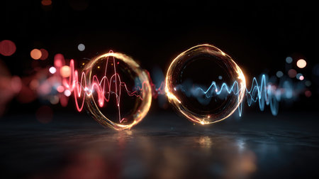 This captivating image displays two glowing spheres emitting vibrant energy waves against a dark background, creating an abstract and tech-inspired visual effect.