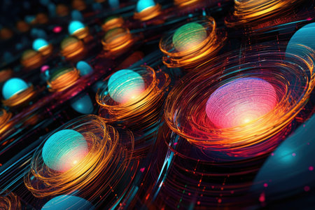 This image presents a digital artwork featuring glowing spheres connected by orbiting lines. The composition employs a dark background and vibrant blue and purple hues to emphasize the central energy elements. Suitable for illustrating technological concepts or science visualizations, this style is apt for various editorial and commercial projects.