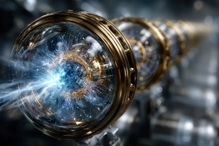 An image showcases a central energy sphere radiating beams of bright light within a complex arrangement of metallic structures. The scene is illuminated with a cool color palette featuring blues and reds, suggesting a high-tech environment. This visual is suitable for conceptual applications in science, technology, or design.
