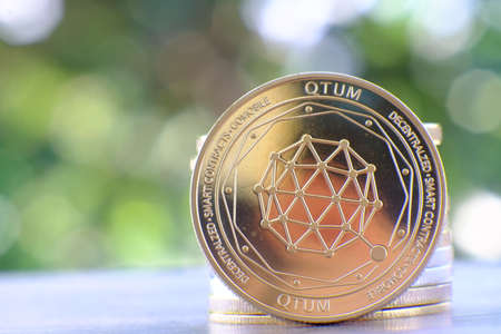 Kharkov, Ukraine - January 31, 2022: Qtum coin symbol. Trade with cryptocurrency, digital and virtual money, banking with mobile phone concept. Business workspace, table with laptop top view