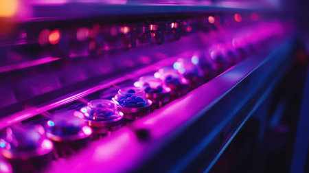 A stunning close-up image showcasing capsules illuminated by vibrant neon lights in a modern pharmacy environment, emphasizing health and innovation.
