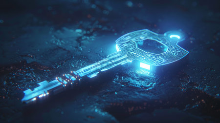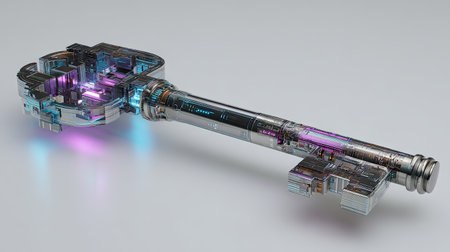 This image features a sleek futuristic key with a glowing red light and icy texture, set against a dark background that enhances its modern design.