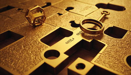 Golden puzzle with gold rings and key in the middle. Toned.