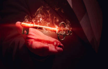 A businessman holding a shining key. Successful business idea.