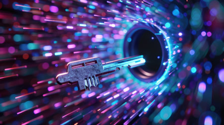 A captivating abstract image featuring a metallic key amidst swirling colorful lights, symbolizing security and digital access in a futuristic setting.