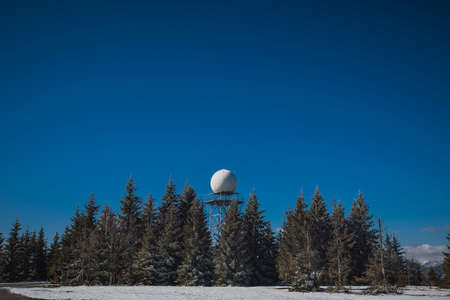 Doppler rain or weather radar on the top of the hill called Pasja Ravan in Slovenia on cold winter day. Beautiful sunny day and rain radar in between.