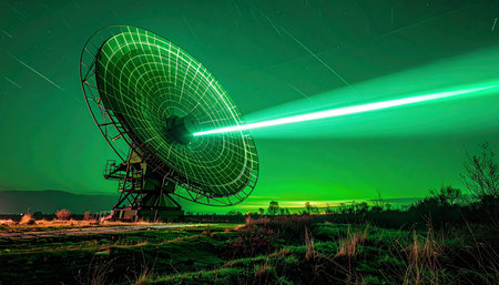 Under a dark sky, a massive satellite dish hums with power, sending a brilliant green laser beam into the vast expanse. This powerful transmission represents a leap in communication technology, a signal of discovery, and humanitys unending search for connection across the universe.