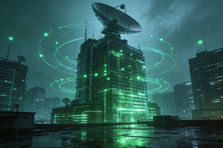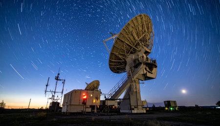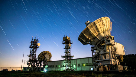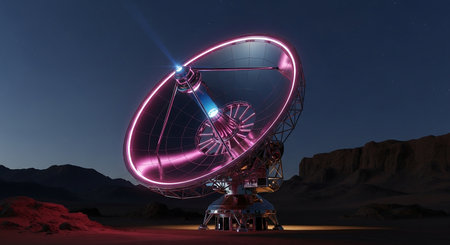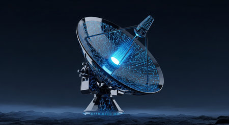 Satellite communication dish with night sky backdrop and digital signal effects