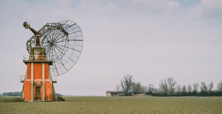 Retro future: broken and abandoned radio telescope in the plain of the Po valley near to Bologna, Italy.