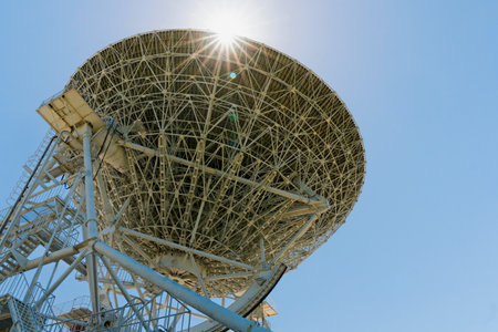 Radio telescope dish against a clear blue sky. Space research.