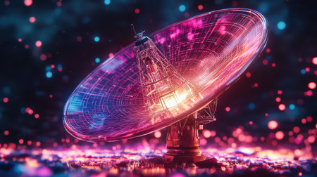 A satellite dish with firefly tech glows in vibrant neon against a dark backdrop