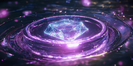 Magic abstract crystal purple energy sphere ball with particles and glowing lines on dark background.