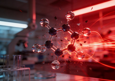 An abstract illustration shows a molecular structure composed of spheres and connecting lines. The composition features diverse colors like red, green, and blue against a dark background, with a focus on depth and detail. It evokes a scientific or technological setting, suitable for visual representations in research or educational contexts.