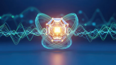 A striking abstract visualization of a translucent capsule glowing with energy and intricate wave patterns, symbolizing the fusion of science and technology.
