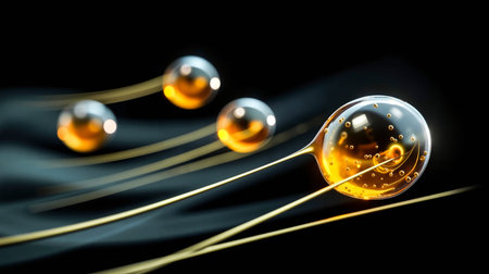 A close-up photograph of three droplets of a yellow liquid each attached to a thin wire against a dark background