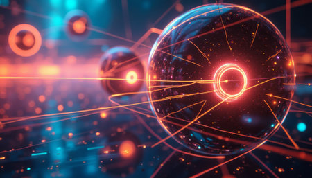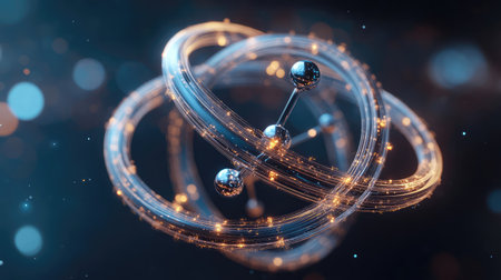 This digital illustration showcases an abstract atomic model with luminous particles and swirling orbits, representing concepts from science and research.