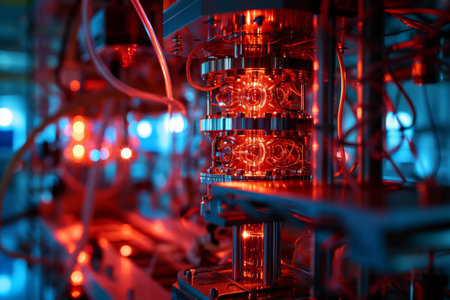 A sophisticated quantum computing device with intricate wiring and glowing components, showcasing cutting-edge technology.