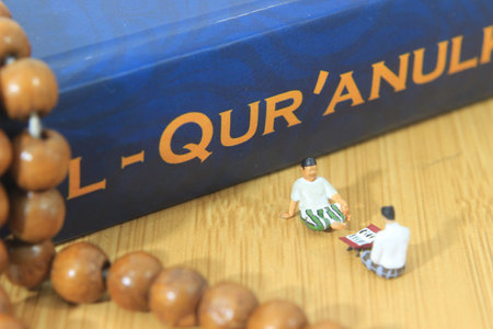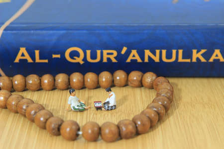 Simple Conceptual Photo, Islam Man or Muslim, Learn Read Al Quran, Al Qur'an Near The Real One and Wooden Prayer Bead, with his teacher