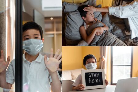 collage with ill asian boy lying in bed, standing at window and holding stay home board on quarantine