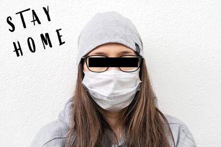 A young woman in a medical face mask on a white background without eyes. Stay home sign. The eyes are crossed out with a black line