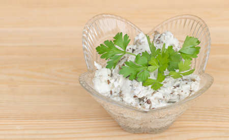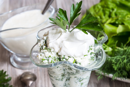 Cottage cheese with greens and yogurt on a light wooden background.