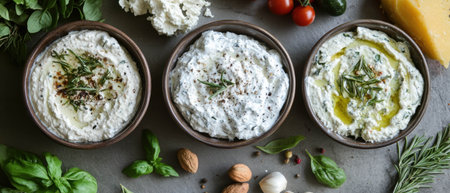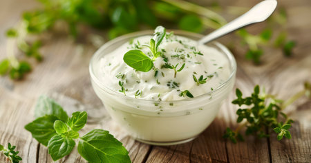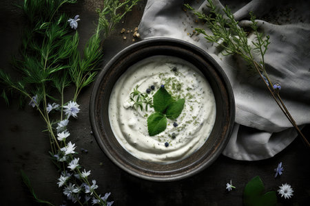 AI Generated. Fresh herb yogurt dip garnished with greens on rustic gray background
